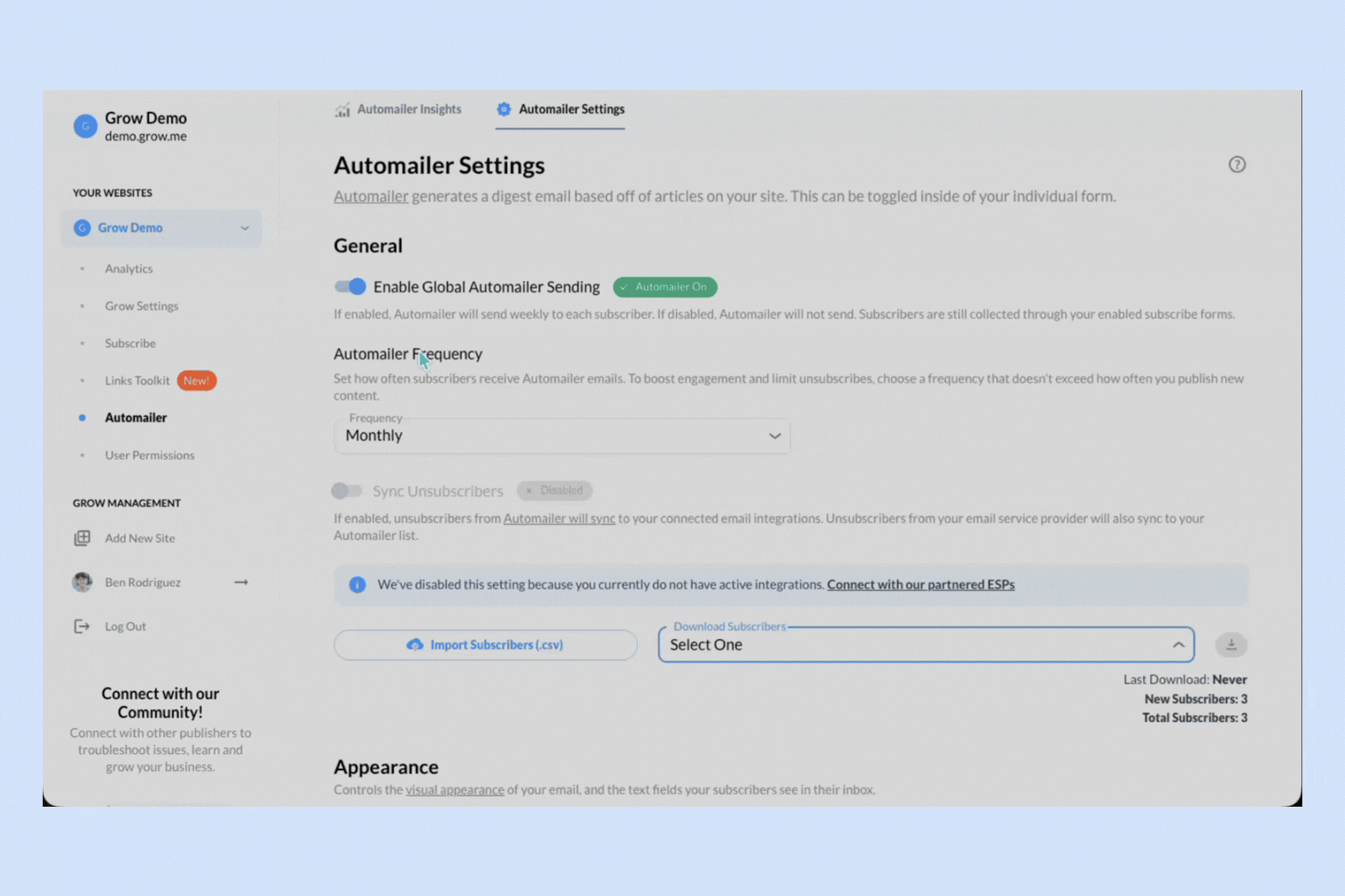 Navigate to Grow Publisher Portal > Automailer > Automailer Settings, find the drop down to Download Subscribers.