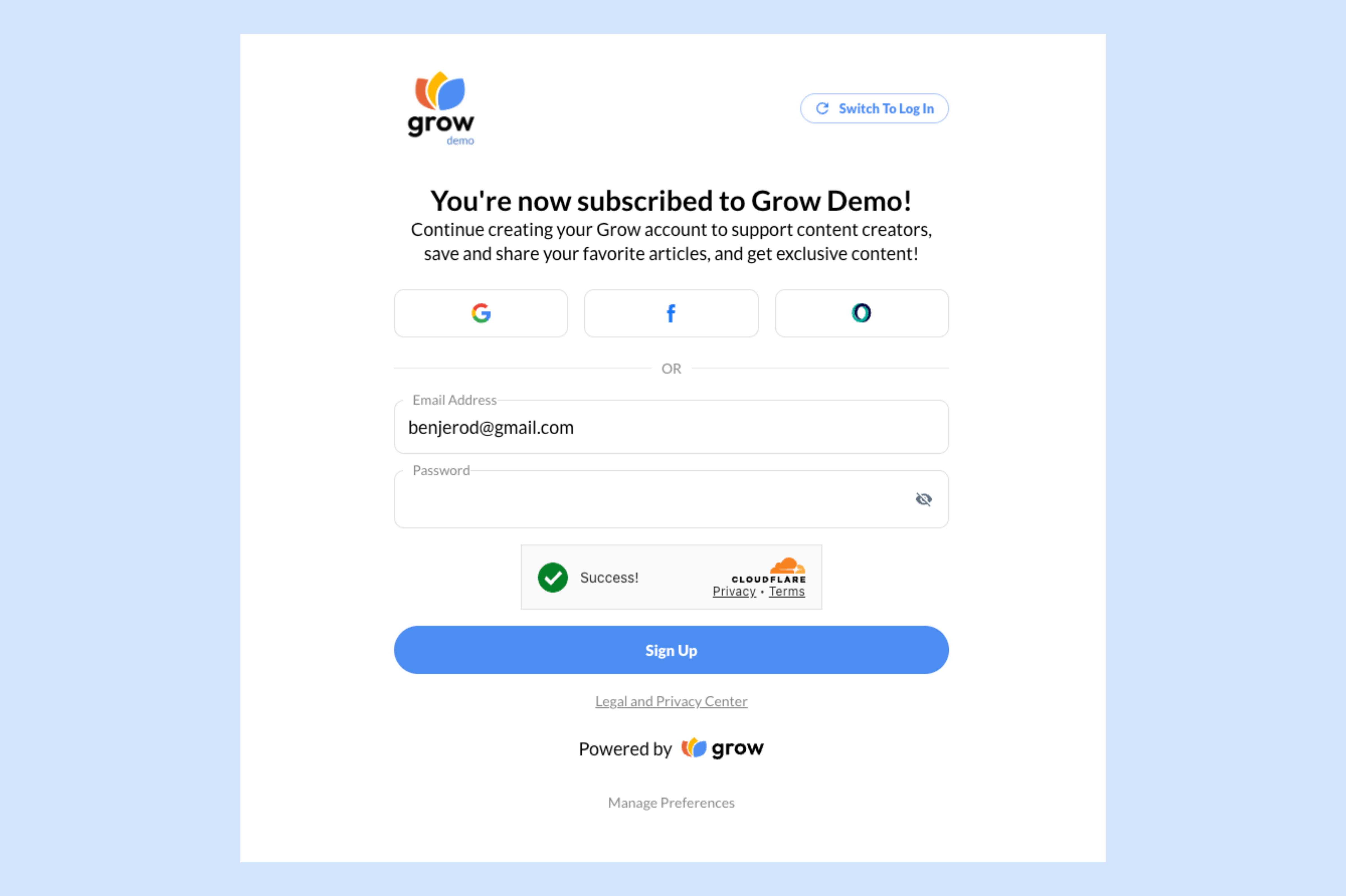 After the reader clicks the Subscribe button, they’ll see a Call to Action to sign up for a Grow Account. This Call to Action will display after the reader has subscribed until they are logged in with Grow: